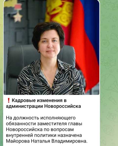 «На должность исполняющего обязанности заместителя главы Новороссийска по вопросам внутренней политики назначена Майорова Наталья Владимировна», — первым об этом рассказал Медиацентр – Новости Новороссийска, потом были репосты в других соцсетях.